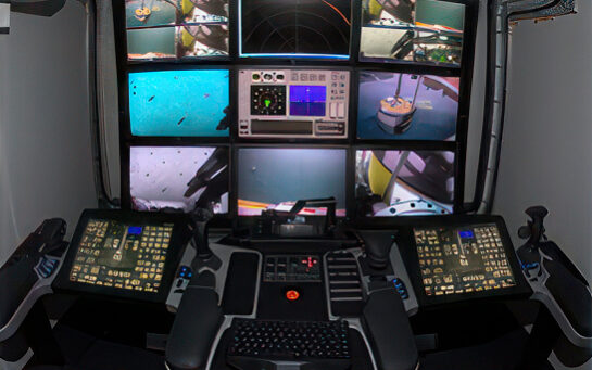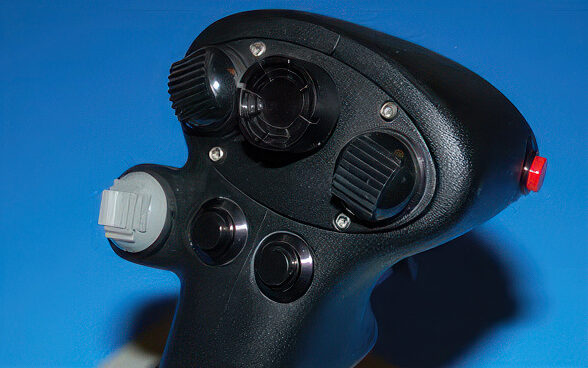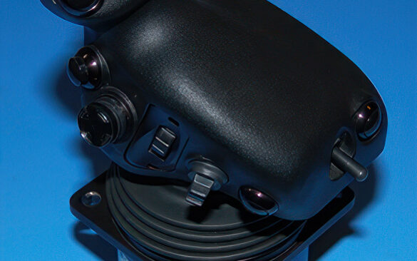 Control console developed to fit into a larger ship born control station. Fixed grip with custom ergonomic layout of control buttons. ARM MCU output to Linux USB. Custom firmware developed for customer requirements